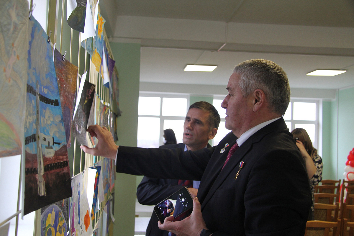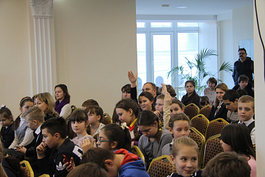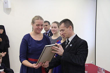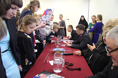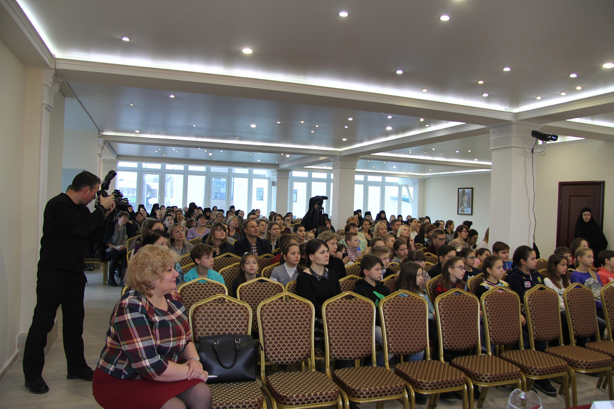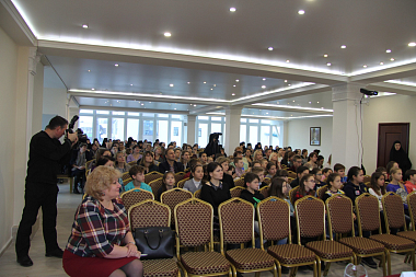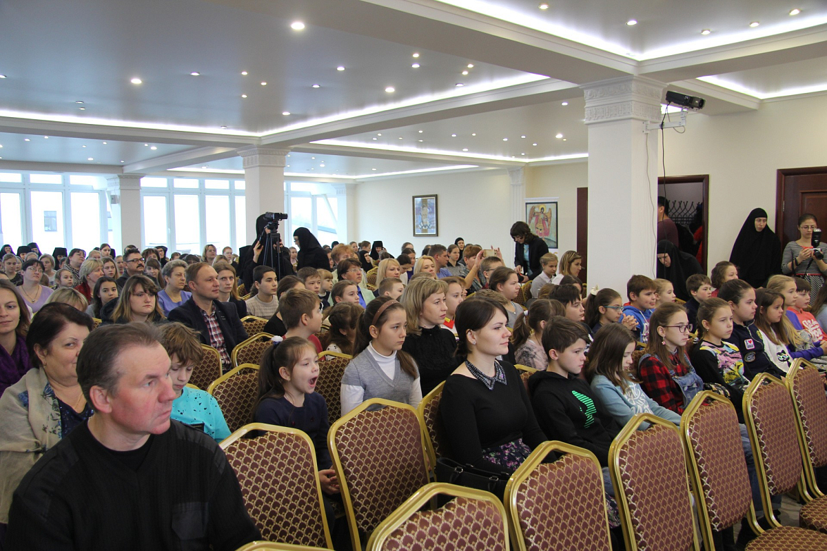 Вслед за старшим товарищем выступил самый молодой из гостей-космонавтов Сергей Николаевич Рыжиков, только в апреле этого года вернувшийся из своего первого полета на орбитальную станцию. Он также показал фильм-презентацию о подготовке космонавтах и тех экзаменах, которые им доводится сдавать во время подготовки к полету, поделился воспоминанием о том, как получал напутствие при выборе профессии. Юрий Иванович Маленченко, уже знакомый учащимся Православной гимназии по предыдущим визитам в Свято-Никольский Черноостровский монастырь, был наиболее краток в своем приветственном слове, и также показал небольшой, 8-минутный фильм про историю Центра подготовки космонавтов с момента его возникновения в послевоенные годы в Советском Союзе. Затем дети смогли задать вопросы героям России, поинтересоваться причинами, вызвавшими в них интерес к космосу, трудностями, с которыми космонавты сталкиваются в своей профессии, а также тем, какими качествами должны обладать покорители космоса.