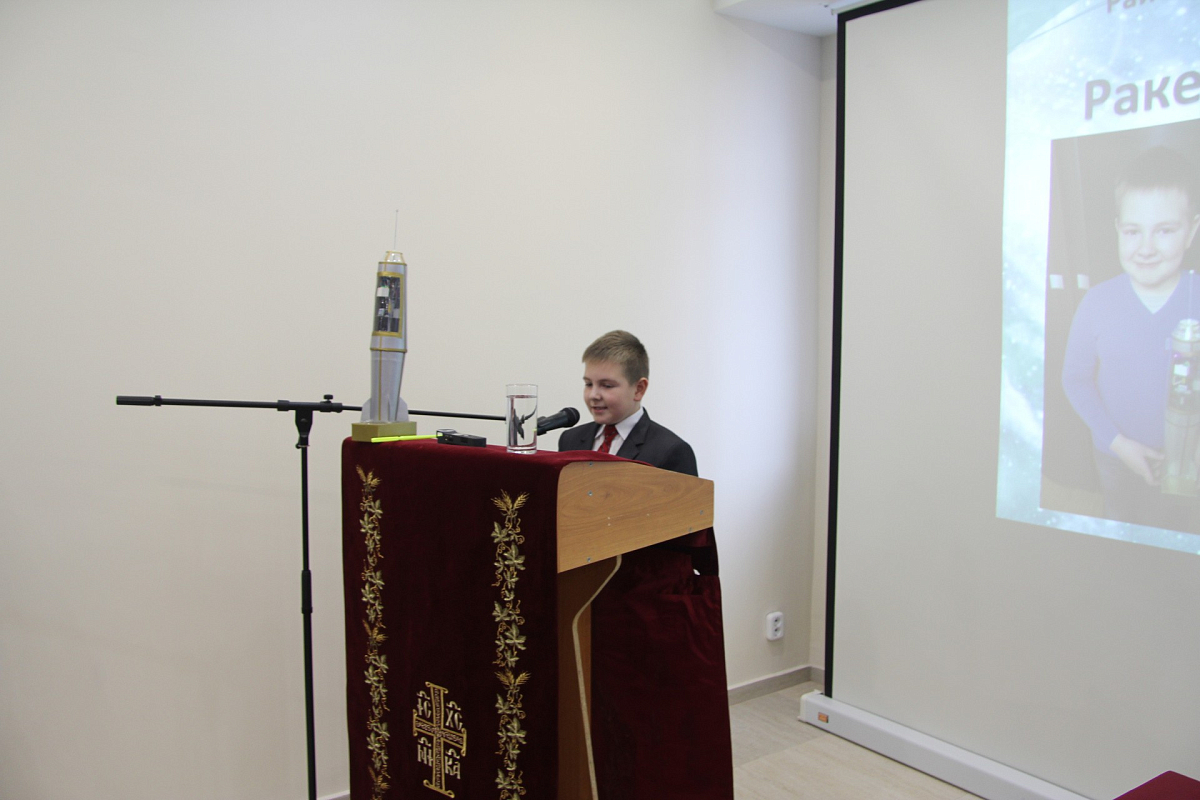 Далее последовали доклады и презентации школьников. Это было и творческое эссе о красоте Неба восьмиклассницы Кондратенко Арсении, и доклад о влиянии Луны на успеваемость школьников, представленный ученицей 11 класса Потяновой Марией, и модель ракеты К.Э. Циолковского, подготовленная учеником 4-го класса Олегом Панкратовым, и экскурс в историю астрономии на Руси ученицы 9 класса Синевой Инны, и иллюстрированная рисунками биография земляка калужцев Константина Эдуардовича Циолковского, 160-летие в дня рождения которого исполнилось в этом году, рассказывающая о том, что такое сила духа ученицы 8-го класса малоярославецкой гимназии Ярославцы Примхи. Сила духа и сила веры — о важности этих двух качеств говорилось и в докладах школьников, и в речах героев-космонавтов. Завершала школьную конференцию презентация ученицы 10 класса Православной гимназии Васяевой Ксении, рассказывавшей об истории общения и встреч учеников Православной гимназии с космонавтами России, начиная с Владимира Джанибекова и кончая героями дня Валерием Корзуном, Юрием Маленченко и Сергеем Рыжиковым. Что интересно, презентация была оперативно дополнена фотографиями и с нынешнего мероприятия, добавляя в копилку уникального опыта детей приюта «Отрада» и города Малоярославца еще примеры мужества, самоотверженности и веры.