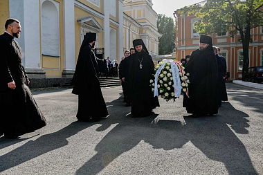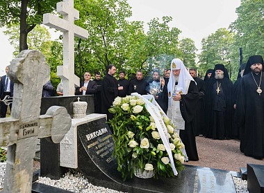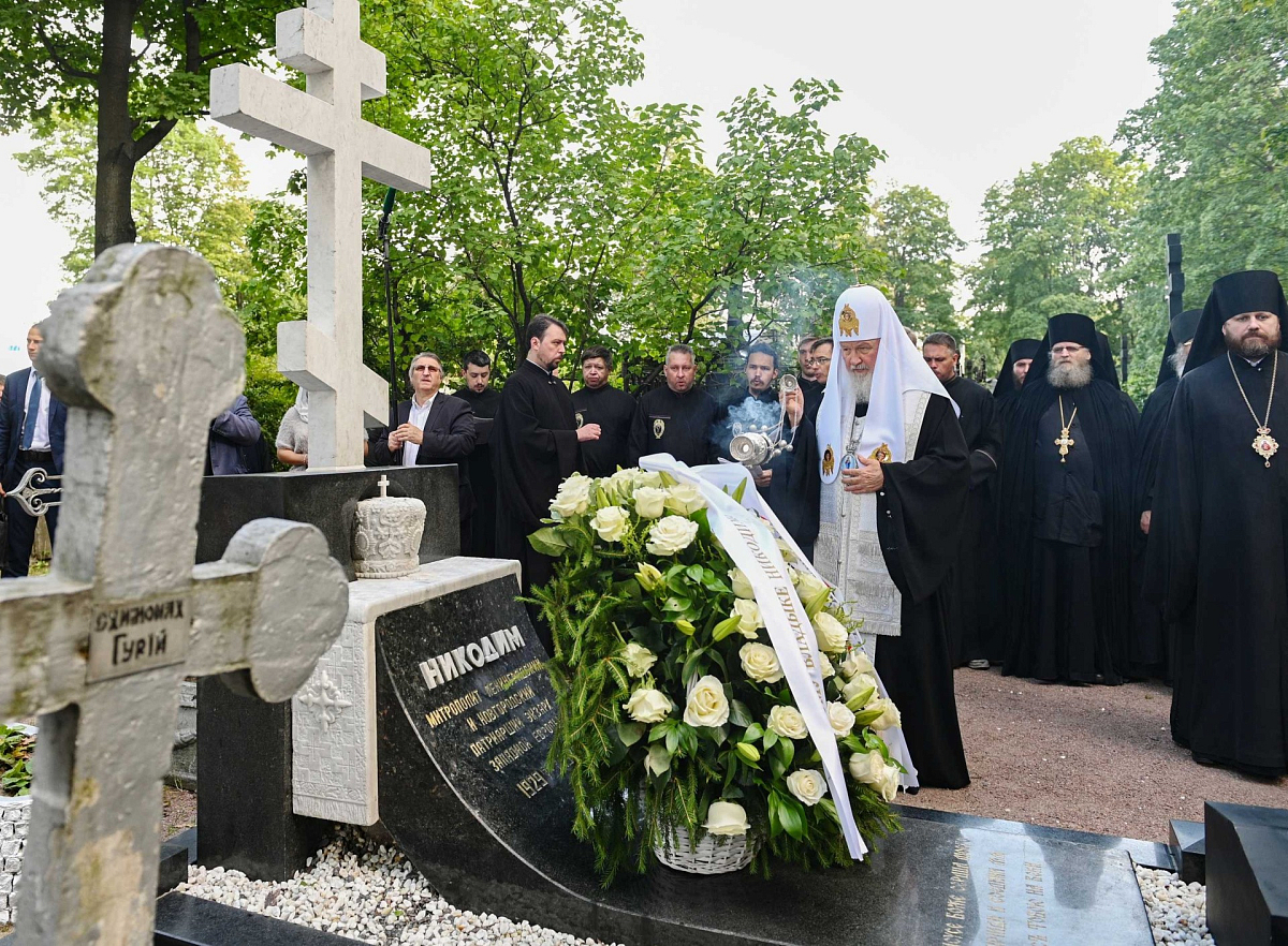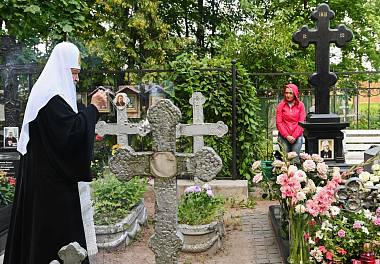Из Троицкого собора Святейший Патриарх Кирилл проследовал на Никольское кладбище монастыря, где возложил венок и совершил заупокойную литию у могилы своего духовного наставника приснопамятного митрополита Никодима (Ротова).