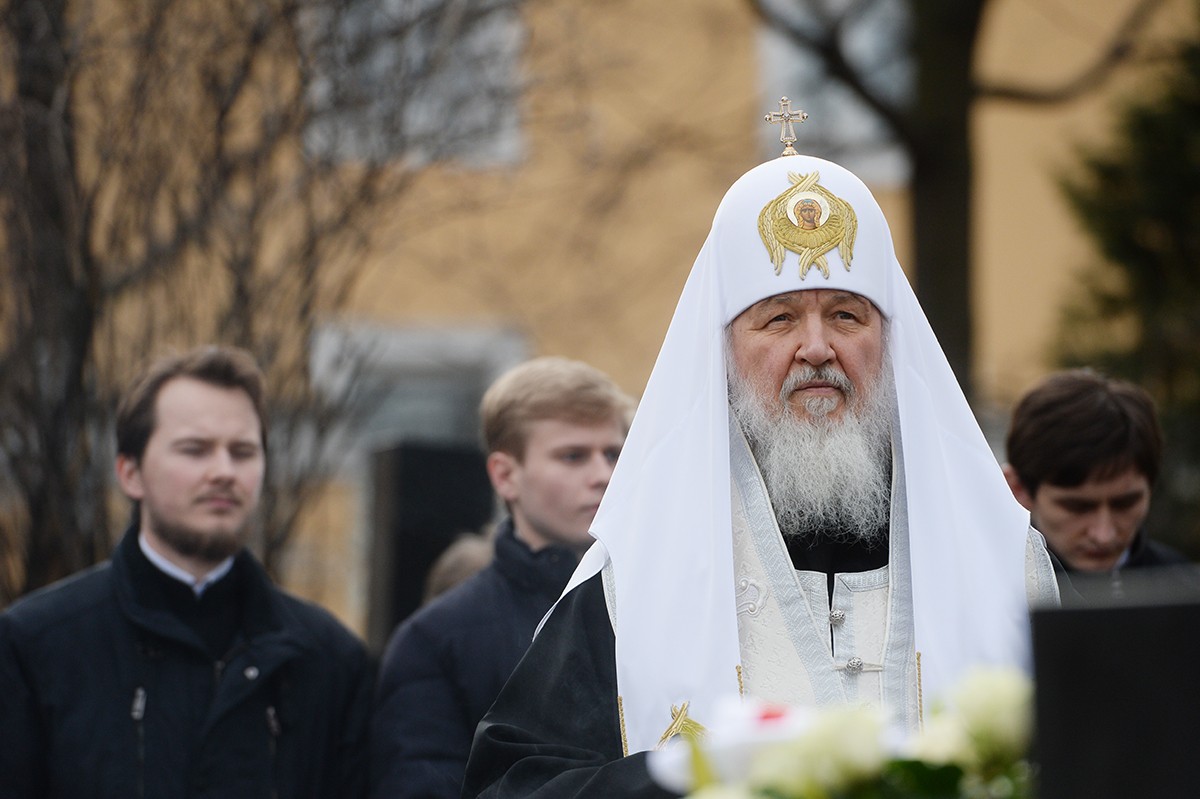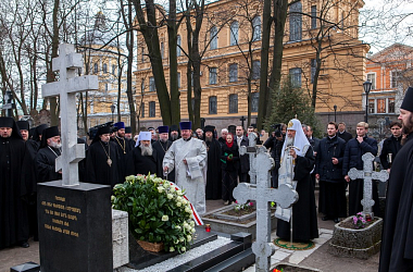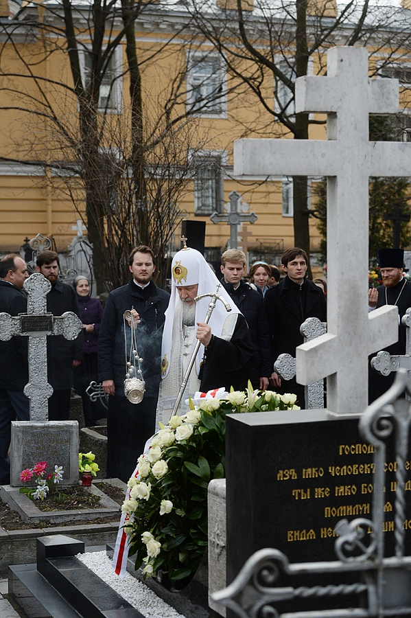 В завершение своего визита в Александро-Невскую лавру на Никольском кладбище обители Святейший Патриарх Кирилл совершил литию на могиле своего духовного наставника приснопамятного митрополита Никодима (Ротова).