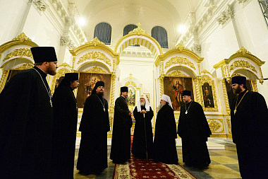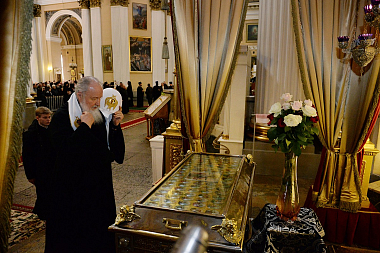 В Троицком соборе обители Предстоятель Русской Православной Церкви поклонился честным мощам святого благоверного князя Александра Невского и чтимой иконе Божией Матери «Скоропослушница Невская».
