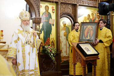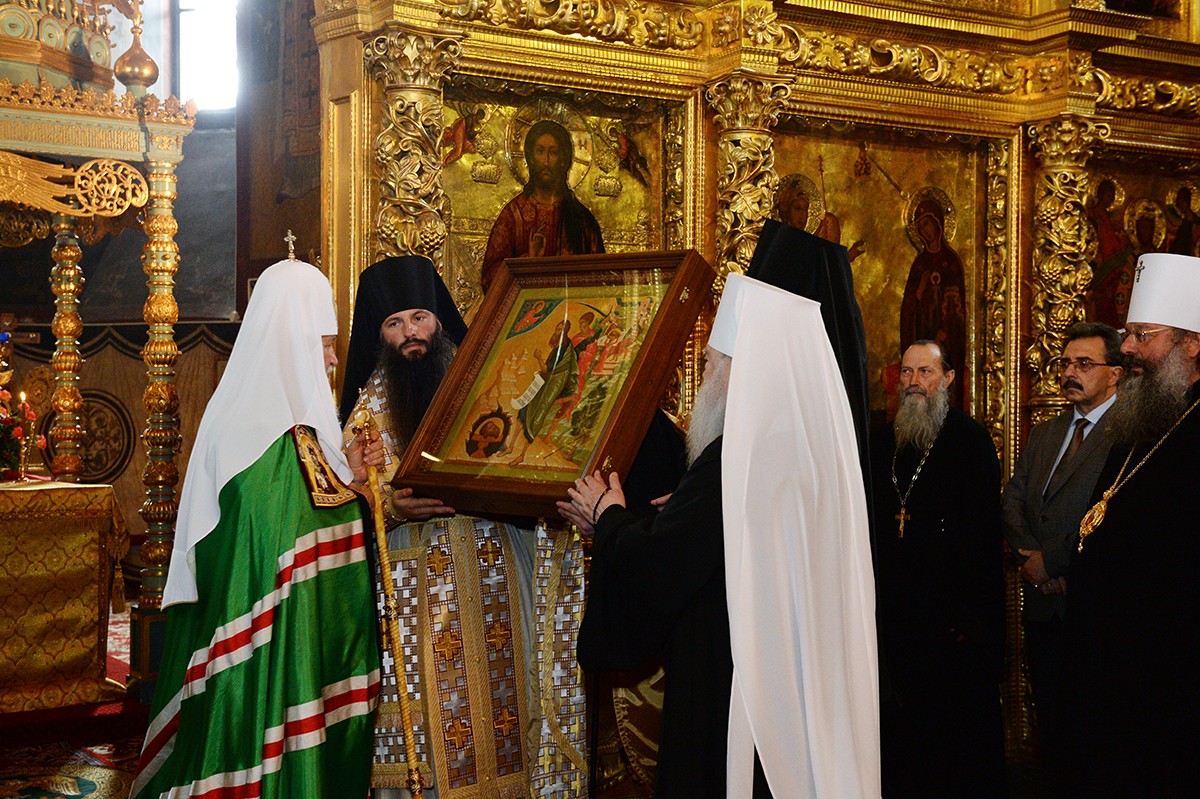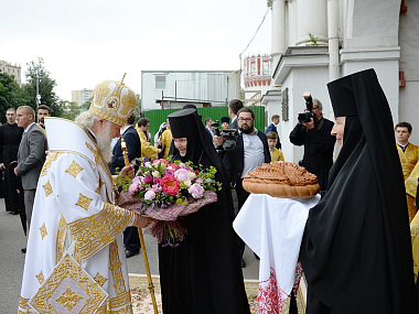 От лица участников богослужения к Святейшему Патриарху Кириллу обратился со словом митрополит Крутицкий и Коломенский Ювеналий, который преподнес Его Святейшеству икону Усекновения главы Иоанна Предтечи – копию образа, который находится в иконостасе воссозданного храма.