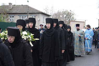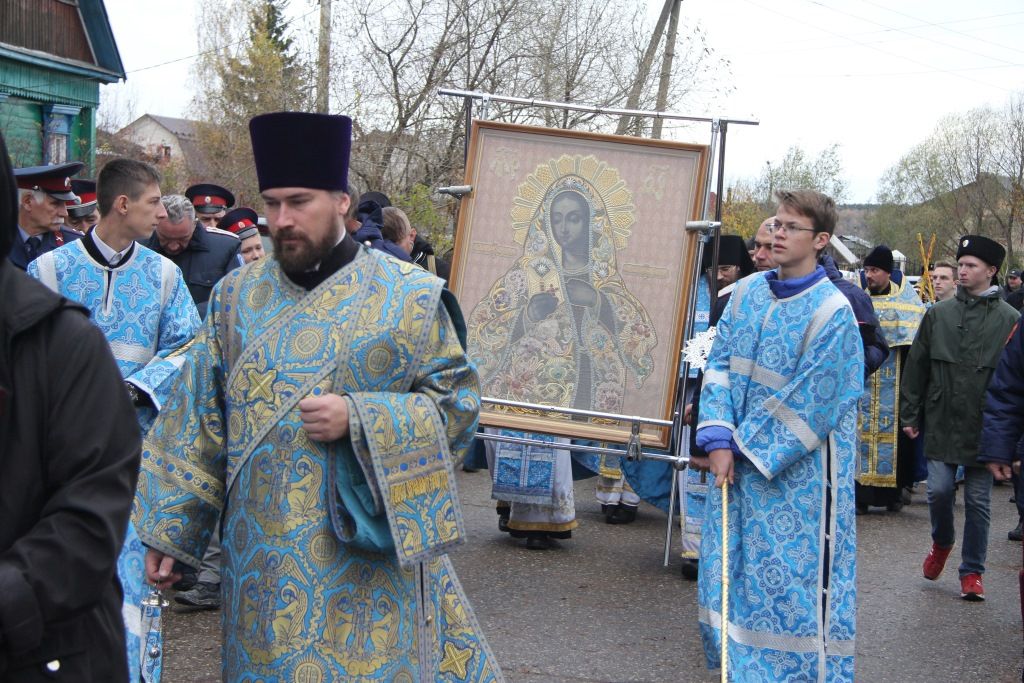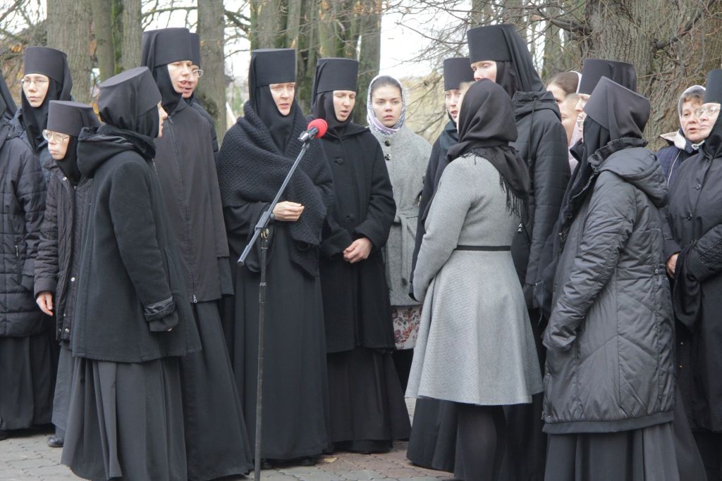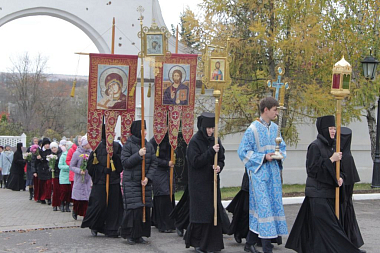 По окончании Литургии ее участники, а также прихожане других храмов города и просто жители и гости Малоярославца, которых в этот день традиционно собирается огромное множество, прошли крестным ходом с чудотворной Калужской иконой от монастыря к памятнику на братских могилах павших воинов в городском сквере памяти 1812 года, где состоялась заупокойная лития.
