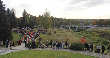 После торжественного открытия и возложения цветов к памятнику у Алешкинского ДОТа мероприятие продолжилось у кургана Славы с памятником подольским курсантам и вечным огнем.