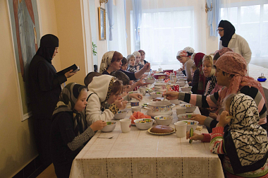 Дети и некоторые родители исповедались и причастились Святых Христовых Таин. По окончании Божественной литургии всем была предложена монастырская трапеза с традиционным чтением за ней. Перед поездкой в монастырь сестры обители всегда проводят занятия с родителями и их детьми, рассказывают об основах Православной веры, о Таинствах Исповеди и Причастия.