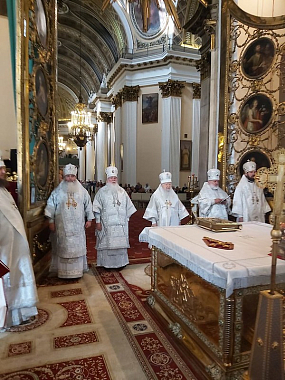 Его Высокопреосвященству сослужили митрополит Новгородский и Старорусский Лев, наместник Александро-Невской лавры епископ Кронштадтский Назарий, епископ Тихвинский и Лодейнопольский Мстислав, епископ Гатчинский и Лужский Митрофан, ректор Санкт-Петербургской духовной академии епископ Петергофский Силуан, настоятель храма святителя Иоанна Милостивого в г. Отрадное протоиерей Василий Стойков, настоятель Троицкого собора г. Подольска протоиерей Александр Ганаба, почетный настоятель Троицкого храма поселка Назарьево Одинцовского района Московской области архимандрит Нестор (Жиляев), духовенство обители и Санкт-Петербургской митрополии, гости в священном сане.