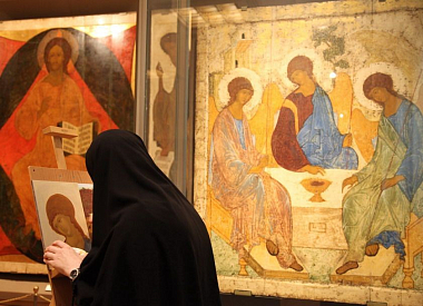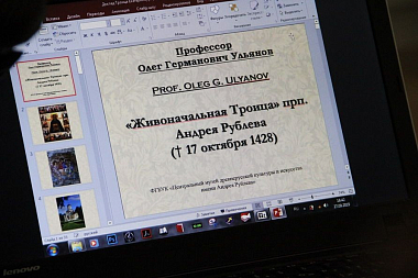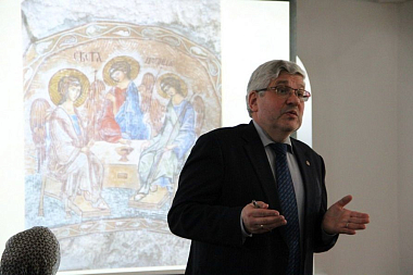 Вторая часть беседы была посвящена величайшему творению преподобного Андрея – иконе Живоначальной Троицы и богословскому осмыслению этого образа. Знаменитый образ был написан по благословению преподобного Никона Радонежского в 1402 году – к десятилетию кончины преподобного Сергия Радонежского. Представив древне-византийские иконы Живоначальной Троицы, Олег Германович показал, как складывалась иконография этого образа. Говоря о символике иконы, профессор Ульянов обращал внимание слушателей на то, что в ней нет ни одной случайной детали, и подробно объяснял богословское значение иконы святого Андрея Рублева, сравнивая ее с другими памятниками древней византийской иконописи. Беседа сопровождалась показом слайдов – сестры получили редкую возможность увидеть различные византийские миниатюры и древнерусские иконы.