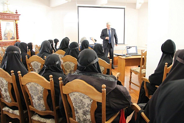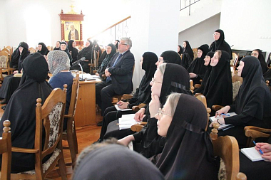 Известный искусствовед и опытный церковный археолог, Олег Германович вначале с подробностями рассказал насельницам обители о своей археологической работе в московском Спасо-Андрониковом монастыре.