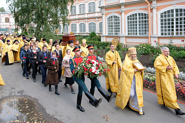 По завершении богослужения крестный ход с мощами святого благоверного князя Александра Невского проследовал к площади перед монастырем, где по встрече двух молитвенных шествий был отслужен молебен, который возглавил священноархимандрит Свято-Троицкой Александро-Невской лавры митрополит Санкт-Петербургский и Ладожский Варсонофий.