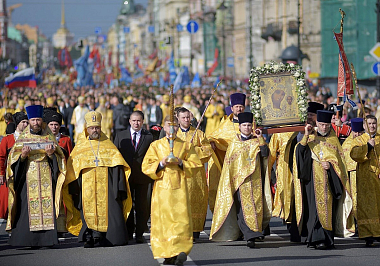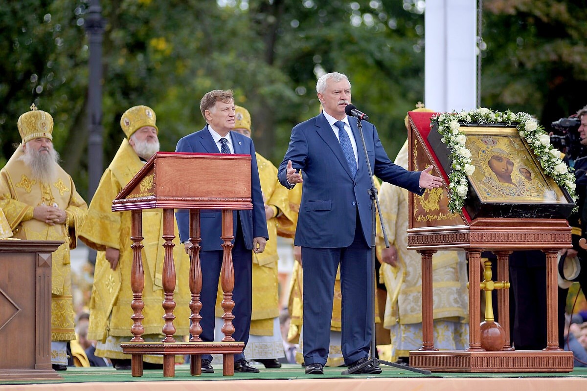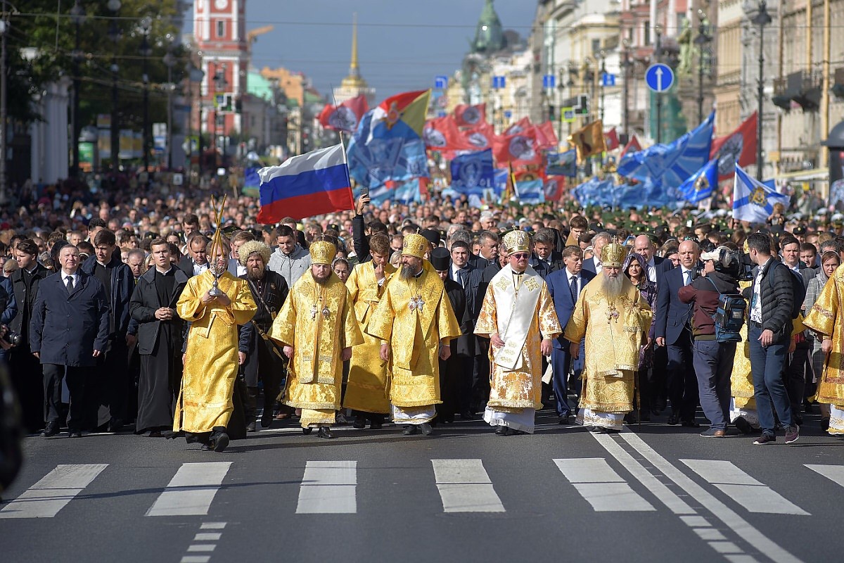 По главной магистрали города были пронесены Казанская икона Пресвятой Богородицы и доставленный ночью в Санкт-Петербург с острова Корфу ковчег с десницей святителя Спиридона, епископа Тримифунтского.