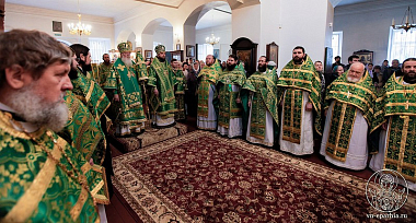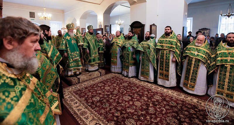 Богослужебные песнопения исполнил мужской хор Новгородского духовного училища под управлением регента диакона Андрея Каурова.