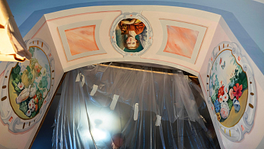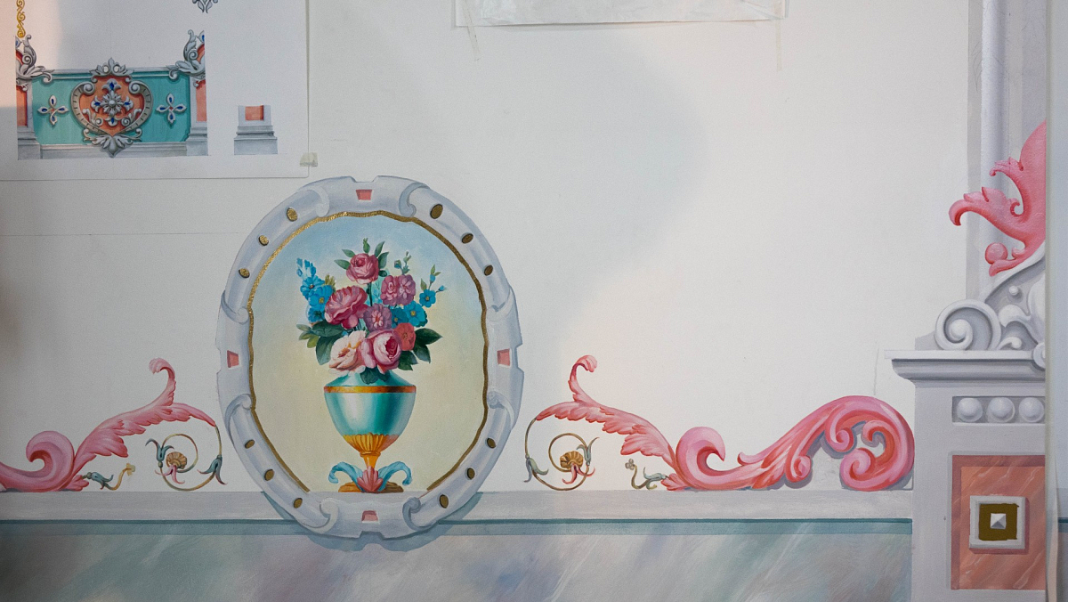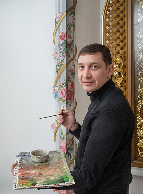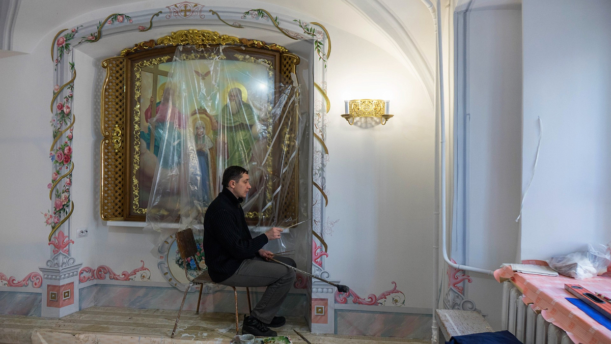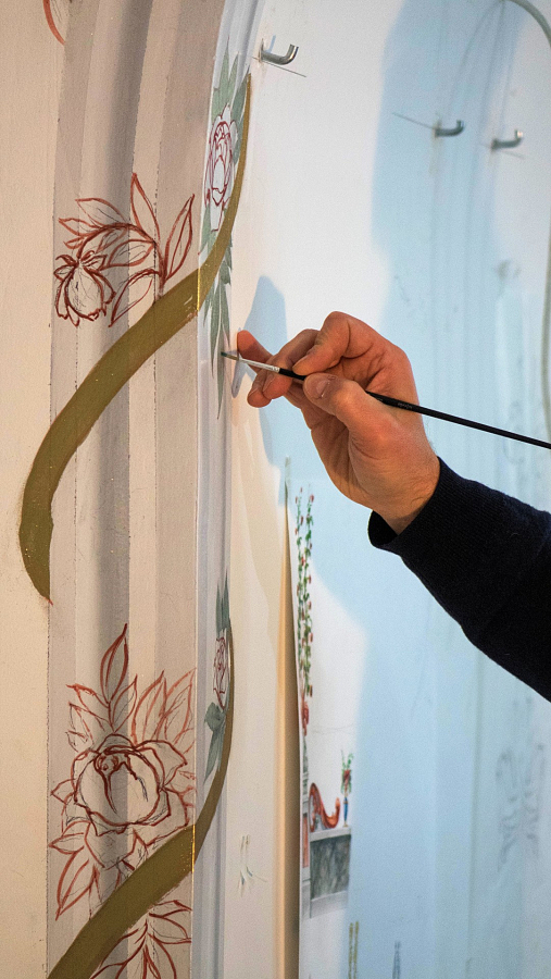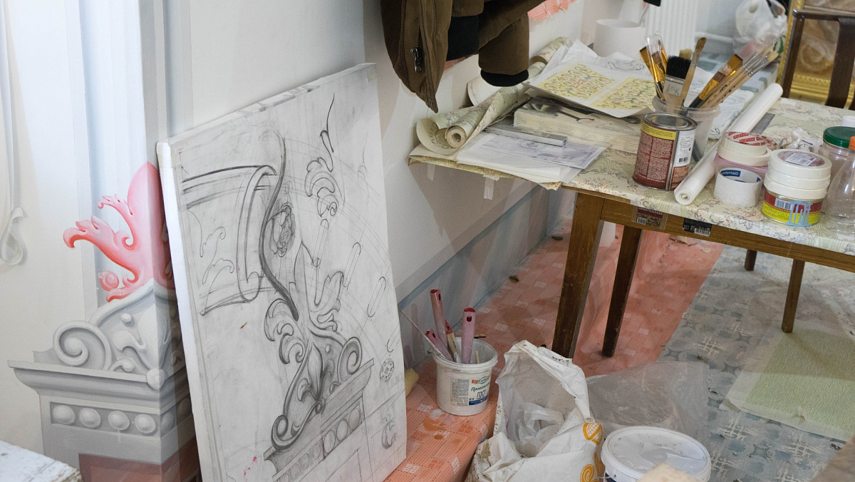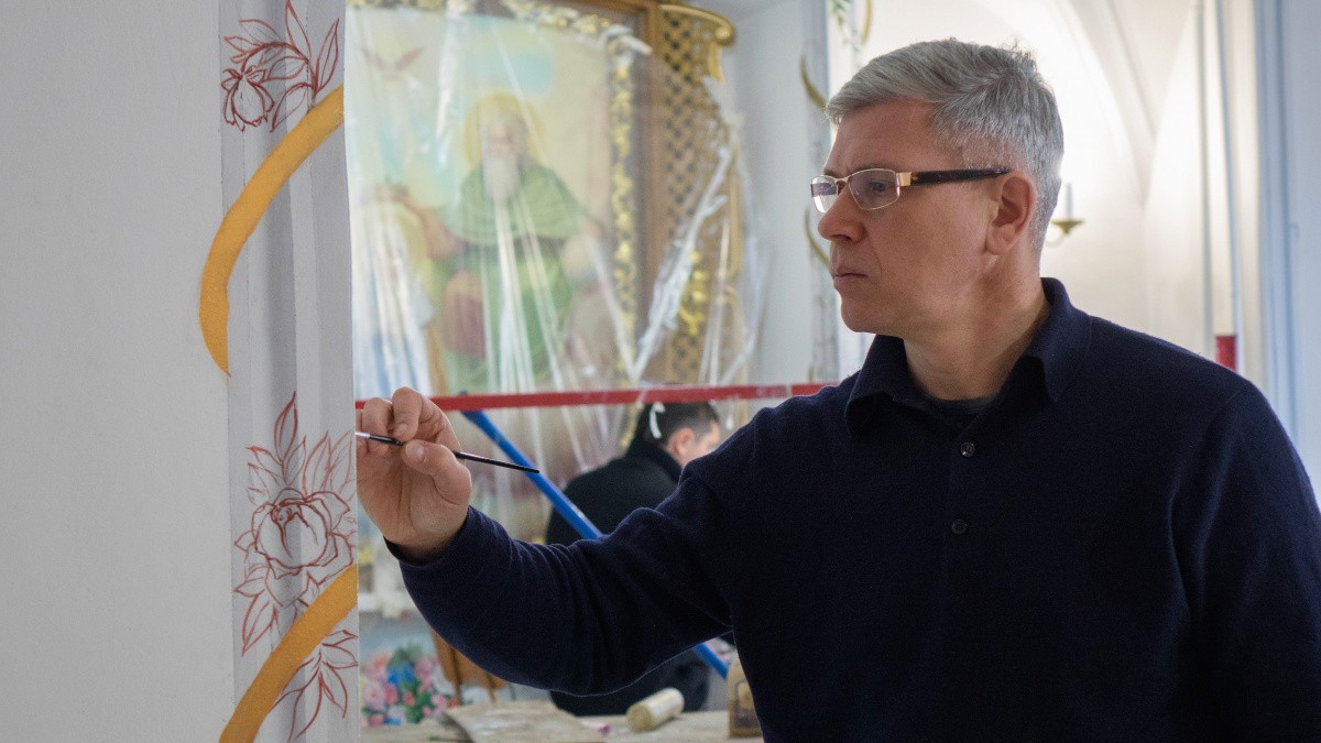 «Цель нашей работы – организовать и композиционно, и в цветовом решении всё убранство храма. Роспись включает несколько этапов. На подготовительном мы создаем эскизы: сначала они "расцветают" в нашей фантазии и в видении настоятельницы обители матушки Филареты, потом с ней же согласовываем все изменения», – рассказывает Дмитрий Соколов.