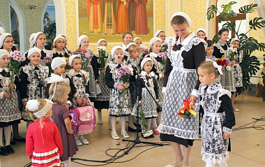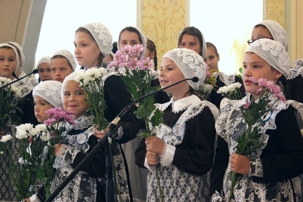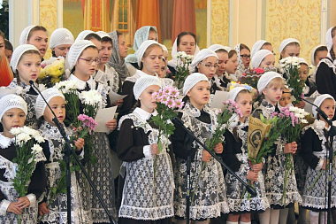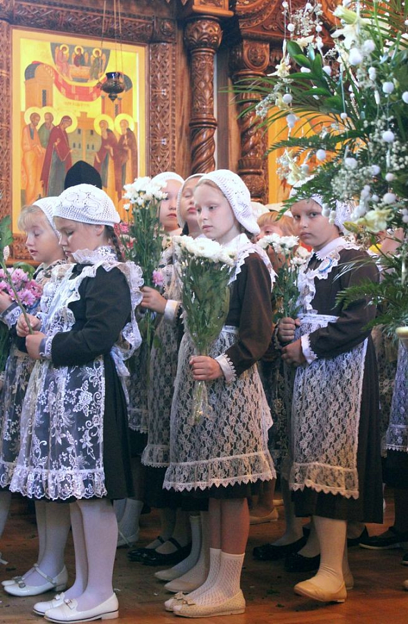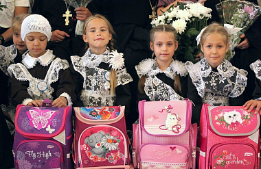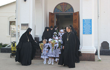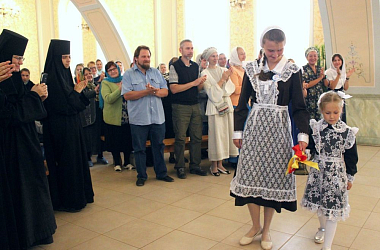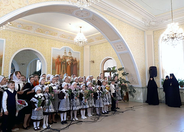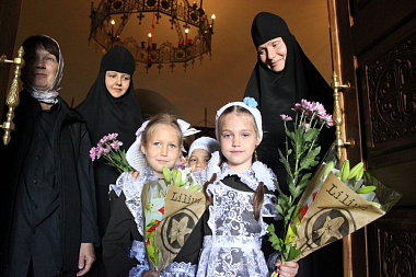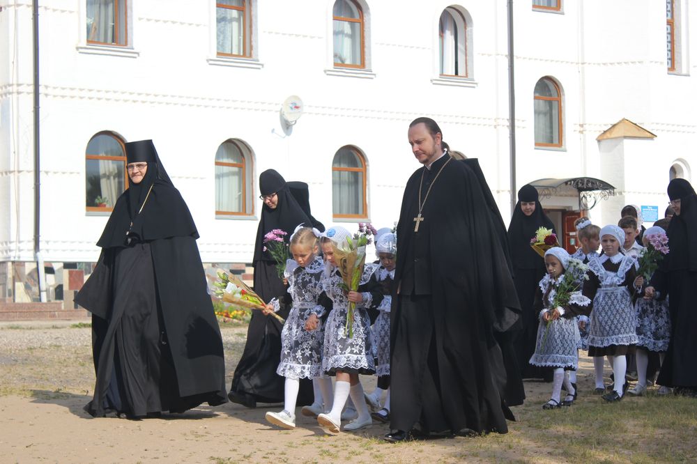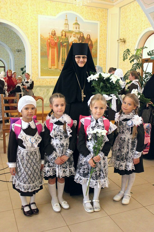 «Дорогие друзья! Наконец-то наступил этот долгожданный день, и вы все такие нарядные, в белых фартучках, пришли на линейку. Поздравляю вас с началом учебного года, с Днем знаний. Вы будете получать и осваивать знания для пользы нашей Родины, для пользы Церкви и монастыря. Стремитесь, чтобы вас украшала культура православной веры.
