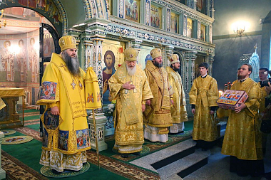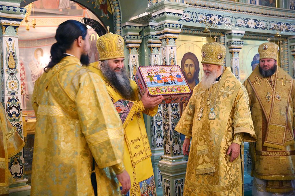 Управляющий Городецкой епархией преподнес в дар митрополиту Георгию шкатулку с городецкой росписью, а каждому участвовавшему в богослужении архиерею – сувенирный городецкий пряник.