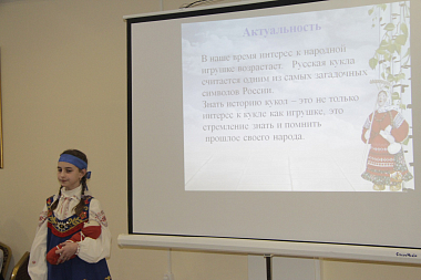 Секция для младших и средних школьников включила в себя красочные творческие презентации. Ученик 5 класса Спасо-Суходревской школы Данила Красовский рассказал о месте рождения Патриарха Пимена; ученики 4 класса этой же школы Никита Костриков и Анастасия Зенова поведали о семейной истории первой учительницы их сельской школы – дочери священнослужителя. Самый младший участник секции Алексей Кошманов, ученик 3-го класса Малоярославецкой МБОУ СОШ № 2, для презентации своего доклада об истории памятника полковому священнику Василию Васильковскому для лучшего погружения слушателей в атмосферу эпохи надел мундир образца 1812 года. Ученица 5 класса Анна Багрова, для представления своего проекта тоже надевшая костюм, в данном случае народный, рассказала о значимости изучения истории кукол для понимания истории своего народа и продемонстрировала кукол, сделанных вместе с одноклассницами своими руками. Ученица 7 класса Кудиновской школы Ирина Холина также продемонстрировала на себе изготовленный своими руками народный костюм и подробно объяснила, как должен выглядеть девичий костюм Калужской губернии. Ученица Детчинской школы Анастасия Валишина рассказала об особо охраняемой природной территории Малоярославецкого района – усадьбе Белкиных в с. Дольском.