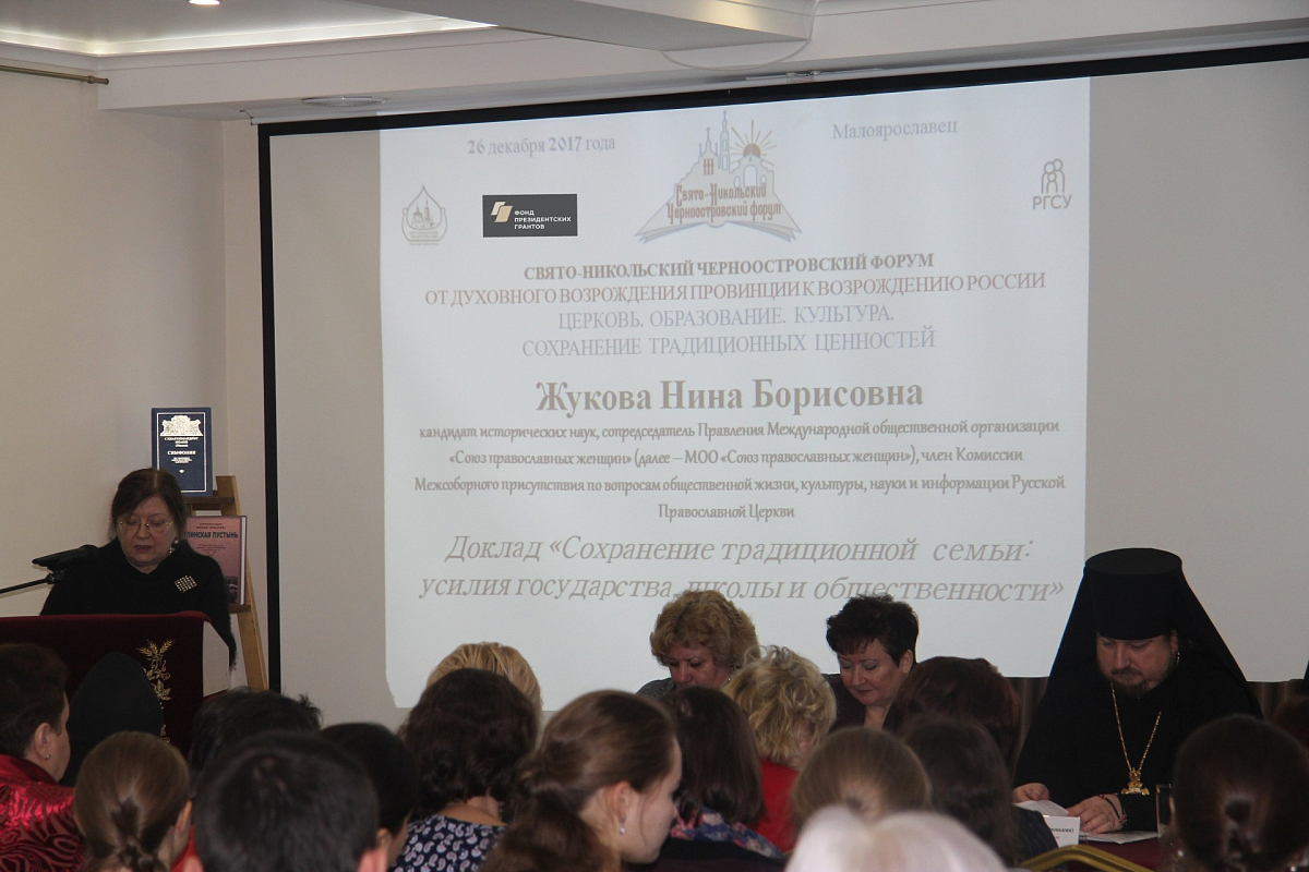 Следующий доклад был прочитан Т.В. Анохиной, заместителем председателя Комиссии по религиозному образованию и катехизации Калужской митрополии, также являющейся членом МОО «Союз православных женщин». В сообщении были обрисованы современные угрозы традиционной, в том числе православной, семье, а через семью – общественной и национальной безопасности и представлялись разрабатывающиеся еще с 2011 года данной общественной организацией для Святейшего Патриарха Московского и всея Руси Кирилла, а также различных законодательных и исполнительных органов власти предложения по вопросам совершенствования национальной политики в области заботы о семье, материнстве и детстве в сфере масс-медиа, социальной защиты, а также системы образования.