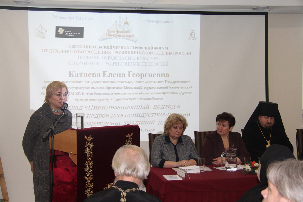 Доклады пленарного заседания освещали проблематику сохранения традиционных ценностей в разных сферах нашего общества в связи с возникновением новых вызовов и угроз. Первый из докладов, представленный Е.Г. Катаевой, ректором ФГОУ высшего образования МГТУ «Станкин», членом Попечительского совета целевой комплексной программы «Духовно-нравственная культура подрастающего поколения России», освещал цивилизационный подход в подготовке кадров для реиндустриализации России, возрождение традиций русской инженерной школы. Зачем нужны духовно-нравственные ценности и патриотическое воспитание для инженерных кадров? По этому вопросу новый ректор «Станкин» дала исчерпывающее объяснение. Без патриотизма, нравственных ориентиров мы не только не можем ожидать, что инженеры захотят работать на благо общества и своей Родины, но и вряд ли у нас появятся новые нестандартно мыслящие королёвы или поповы, способные совершить прорыв в техническом творчестве, так как «практико-ориентированные компетенции», на освоение которых ориентирован международный стандарт требований к инженерному образованию, не могут сделать человека ни изобретателем, ни серьезным ученым, способным на научные и технологические открытия. Докладчик предлагает развивать техническое творчество среди подрастающего поколения с более раннего возраста, возрождая станции юных техников и моделистов и в целом способствуя возрождению культуры русской инженерной школы.