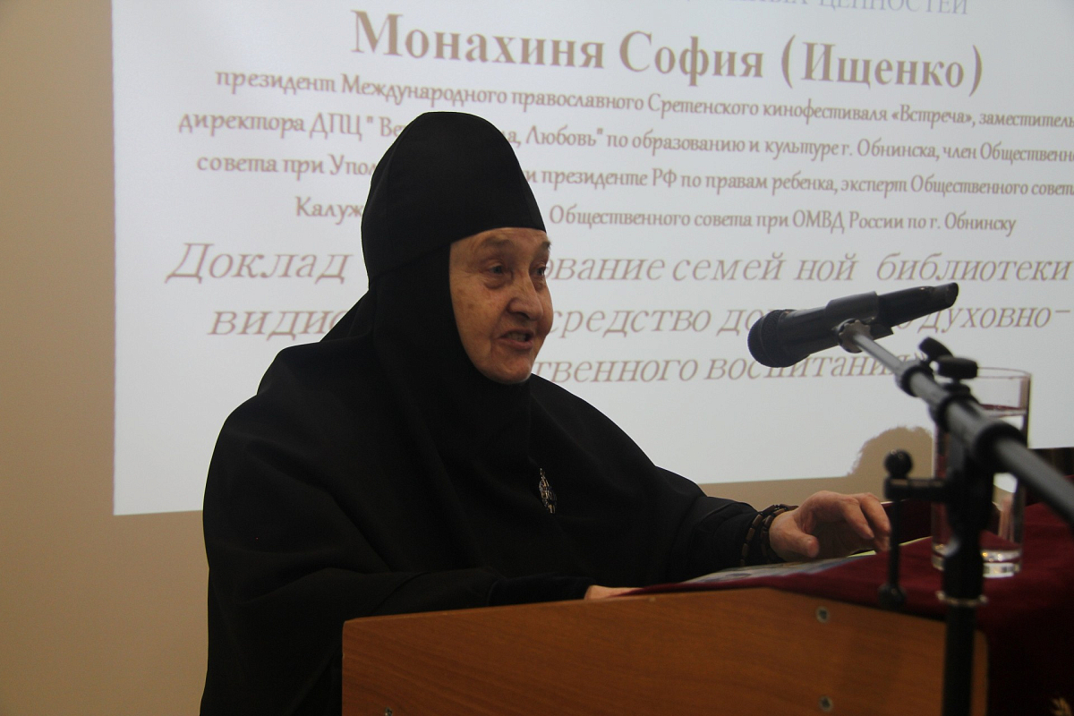 Монахиня София (Ищенко), президент Международного православного Сретенского кинофестиваля «Встреча», заместитель директора ДПЦ «Вера, Надежда, Любовь» по образованию и культуре г. Обнинска, член Общественного совета при Уполномоченном при Президенте РФ по правам ребенка, эксперт Общественного совета Калужской области, представила на форуме доклад о важности формирования семейной библиотеки и видеотеке для сохранения традиционных духовно-нравственных ценностей и рассказала о мерах, которые предпринимают сейчас различные общественные организации, в деятельности которых ей доводится участвовать, выдвинув ряд новых инициатив по выработке рекомендованных списков новых книг и фильмов для совместного семейного чтения и просмотра. Среди прочего президент Сретенского кинофестиваля рассказала, что в рамках их ежегодных мероприятий запланировано проведение минифестиваля семейного кино, поддержанного также Президентским фондом.