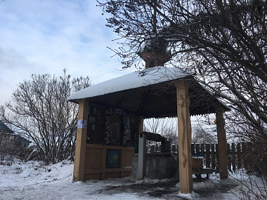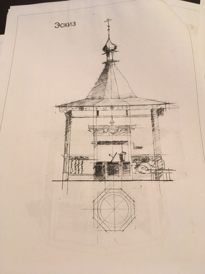 Вместо деревянной сени над колодцем по проекту должна появиться более просторная металлическая конструкция с элементами ковки. Верхняя часть – крыша – по эскизу имеет изгиб по подобию часовен русского Севера. Иконы, которые были дороги отцу Авелю и уже стали дороги жителям села, будут перенесены в новую сень.