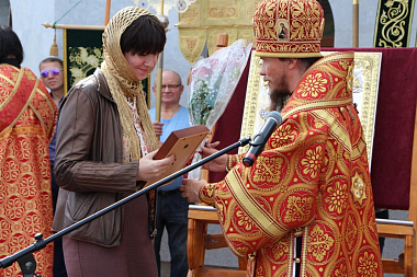 Его Преосвященство поблагодарил и поздравил всех с праздником, вручил иконы св. Пантелеимона на молитвенную память министру социального развития и труда Камчатского края И.Э. Койрович и министру культуры С.В. Айгистовой, также епископ Вилючинский Феодор вручил епархиальные награды – Архиерейские грамоты и благодарственные письма – от лица управляющего епархией архиепископа Артемия церковным труженикам.