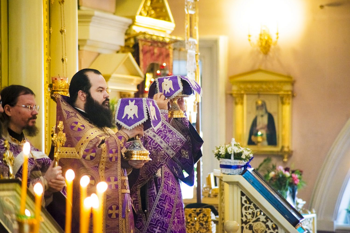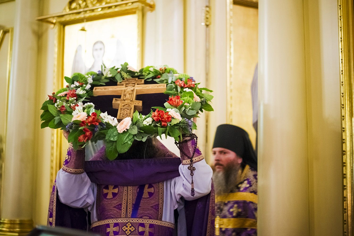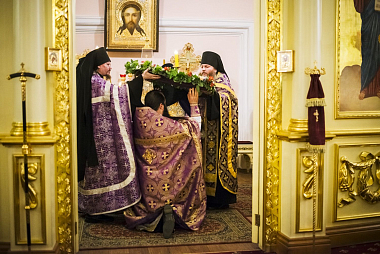 На всенощном бдении был совершен чин выноса Креста на середину храма для поклонения верующим, который зримо и духовно сближает современных христиан с тем днем, когда Крест Господень после трех столетий забвения был обнаружен равноапостольной царицей Еленой и явлен народу.