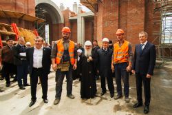 На строительной площадке генеральный директор подрядной организации ООО «Евростройхолдинг+» Владимир Казилов ознакомил участников рабочей встречи с ходом работ, которые активно продолжались осенью и зимой 2016–2017 гг. На сегодняшний день выполнены работы по устройству всех 24 колонн и 6 полуколонн, перекрытия клироса, стен тамбуров, сводов и куполов. Продолжается устройство нижних сводов, водопровода и теплоснабжения, кладочные работы несущих стен.
