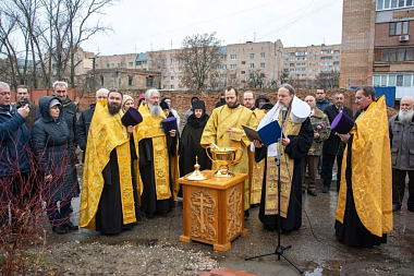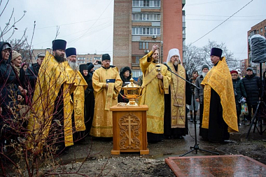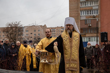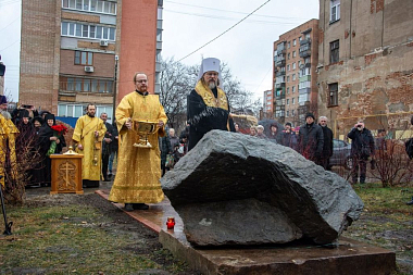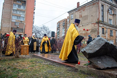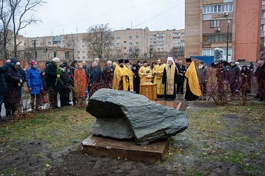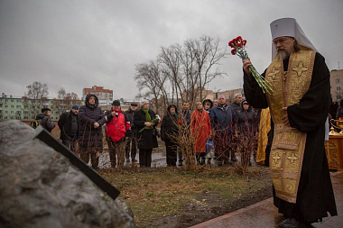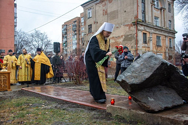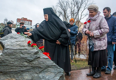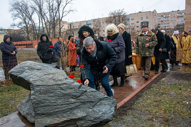 После освящения владыкой памятного знака все собравшиеся возложили к его подножию алые гвоздики.