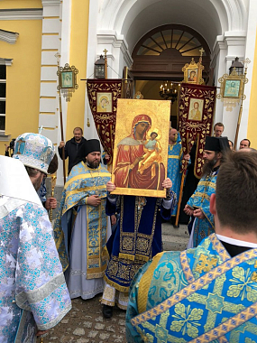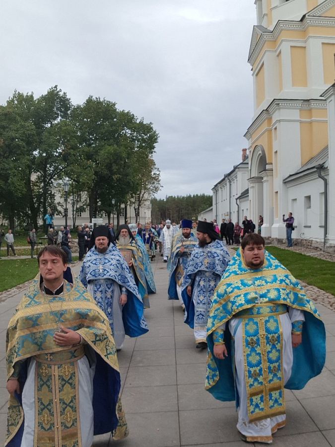 Затем архипастыри возглавили торжественный крестный ход вокруг монастырских стен со списком Коневской иконы Божией Матери, некогда находившимся в иконостасе церкви Коневского скита и возвращенным в 2015 году на остров. Во время крестного хода епископ Игнатий в сослужении епископа Мелетия совершил панихиду на старинном братском кладбище монастыря. Крестный ход вокруг монастырских стен в день престольного праздника также стал событием в новейшей истории обители: долгое время по причине реставрационных работ крестные ходы вокруг стен не проходили.