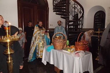 По завершении Литургии был отслужен молебен с освящением винограда и плодов. Освятили виноград и фрукты из монастырского виноградника и сада.