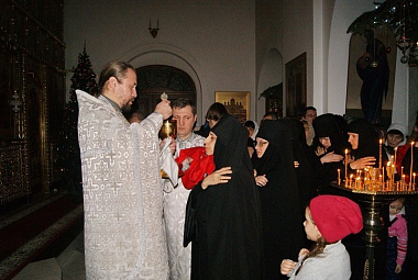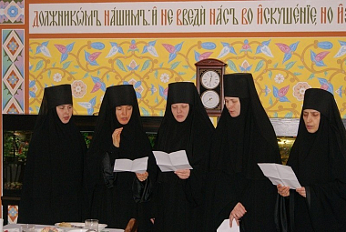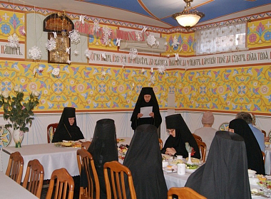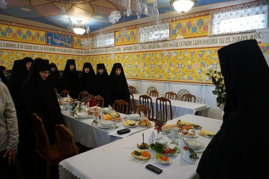 Далее в монастырской трапезной еще раз поздравили друг друга с Рождеством Христовым и разговелись за праздничным обедом. Певчие сестры исполнили рождественскую песню. Приглашенные гости – постоянные помощники монастыря – благодарили игумению Неониллу за создание и благоустройство обители.