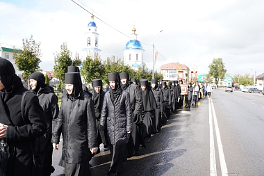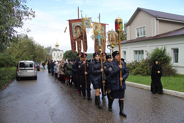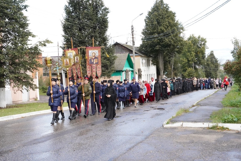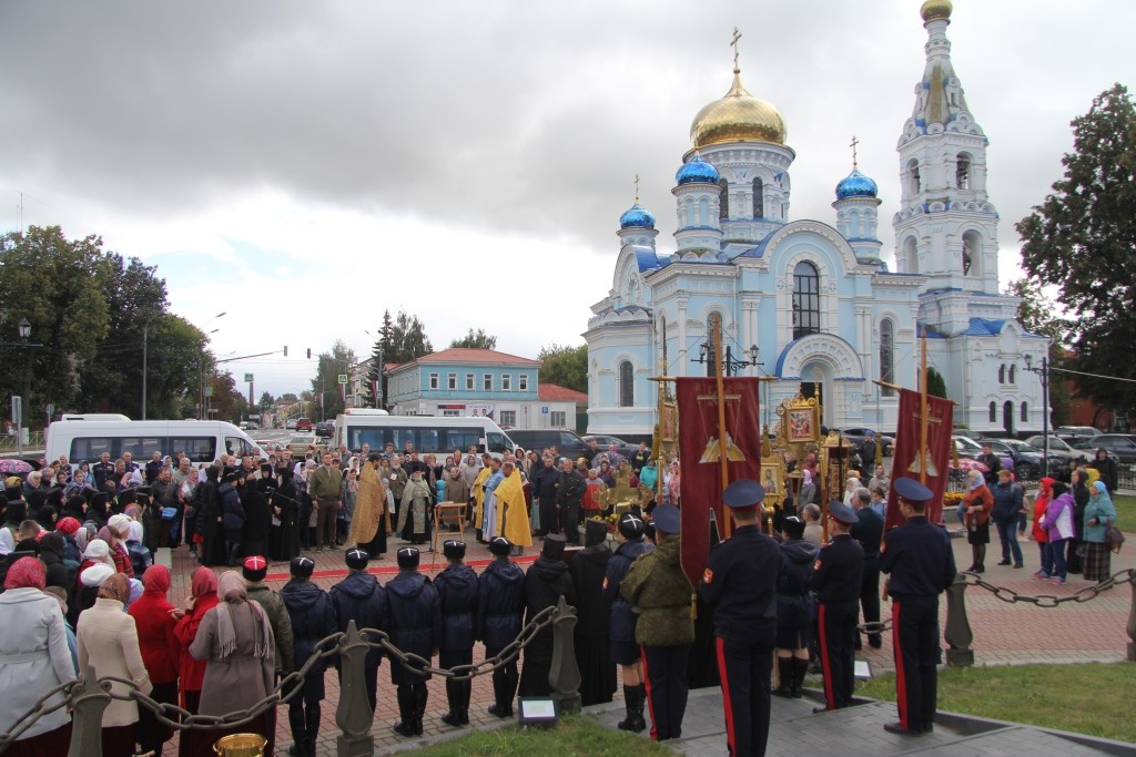 Затем от площади перед монастырем выдвинулся крестный ход, к которому у Казанского храма рядом со зданием духовно-просветительского центра «София» присоединились крестный ход, идущий от Иоанновского и Казанского храмов города. Остановив ненадолго движение на проезжей части крестный ход вышел на соборную площадь рядом с Успенским собором, построенным к 100-летию Отечественной войны 1812 года напротив монумента Славы и здания районной администрации.