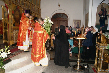 Сестринский хор исполнил византийским распевом многолетие. Насельницы и прихожане монастыря поздравили его настоятельницу и преподнесли Ее Высокопреподобию цветы.