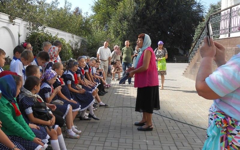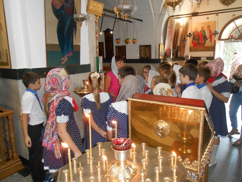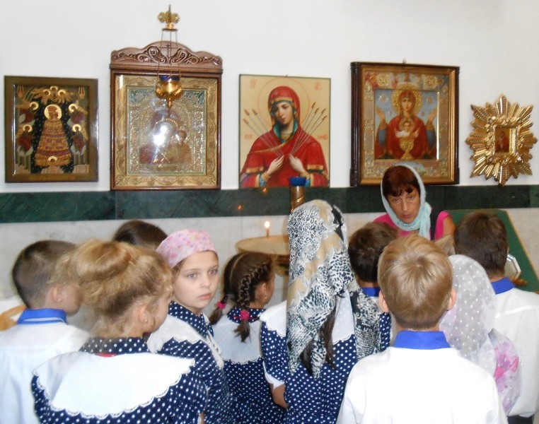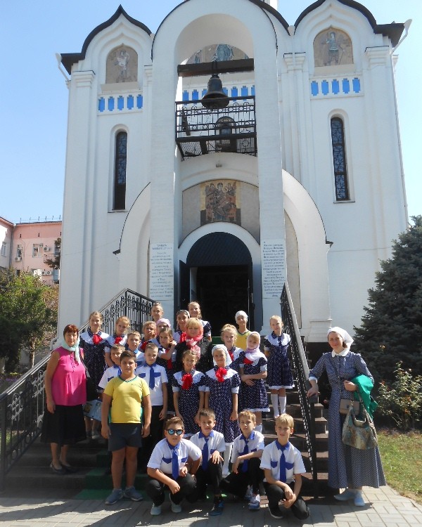 Учитель ОПК Валентина Антоновна Дубровина, взяв благословение у игумении Неониллы, ознакомила учащихся с историей создания женского монастыря в г. Краснодаре рядом с краевым онкологическим центром. Они узнали о том, что такое монастырь и чем занимаются священники и монахини, ознакомились с устройством православного храма (храмом «Всецарица» в русско-византийском стиле), со святынями монастыря, с историей написания на Афоне главной святыни обители – иконы Божией Матери «Всецарица». Монахиня-экскурсовод, педагог по образованию, рассказала им об устройстве часовни-крестильни в честь Святого апостола Иоанна Богослова и об этом апостоле любви, о Таинстве Крещения, об украшающих храм и часовню флорентийских мозаиках из натуральных камней. Дети узнали также, что об успешной учебе молятся Пресвятой Богородице пред Ее иконой «Прибавление ума» (для посещающих монастырь учащихся и студентов ее специально написал в 2005 г. краснодарский епархиальный иконописец Ю.Н. Найденов) и преподобному Сергию Радонежскому. Узнали, что такое Голгофа и как молиться у кануна об уже почивших сродниках. Дети посетили монастырскую колокольню с семью отлитыми в Воронеже колоколами и узнали интересные сведения о колоколах.