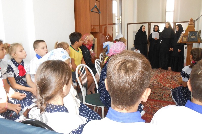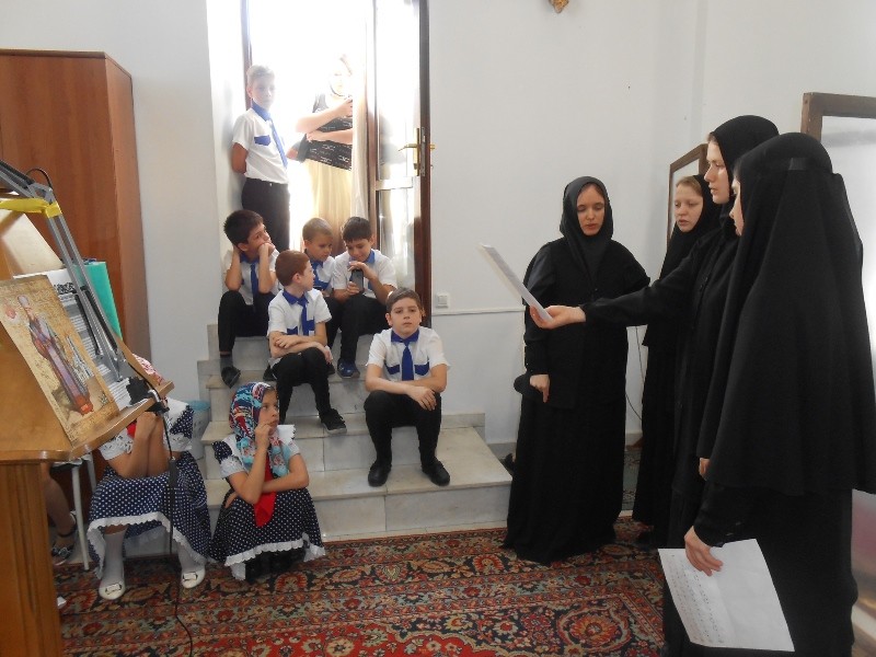 Певчие сестры монастыря исполнили византийским распевом для каждого класса песенку «Зяблик» на греческом языке и ее перевод по-русски. Во дворе ребята попили святой воды. Посетили также живой уголок во дворике между храмом «Всецарица» и корпусом онкодиспансера – пруд с белыми лебедями и вольер с певчими птицами.