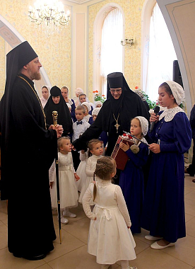 По окончании Литургии владыка поздравил игумению Еротииду и сестёр обители с памятным днём для монастыря.