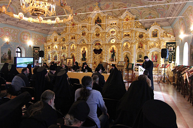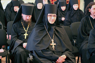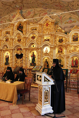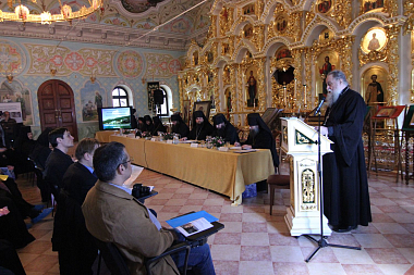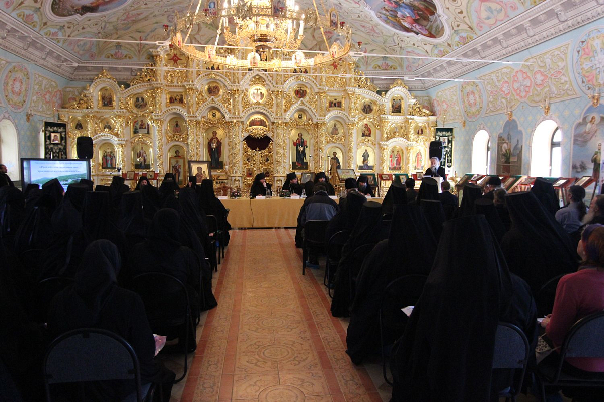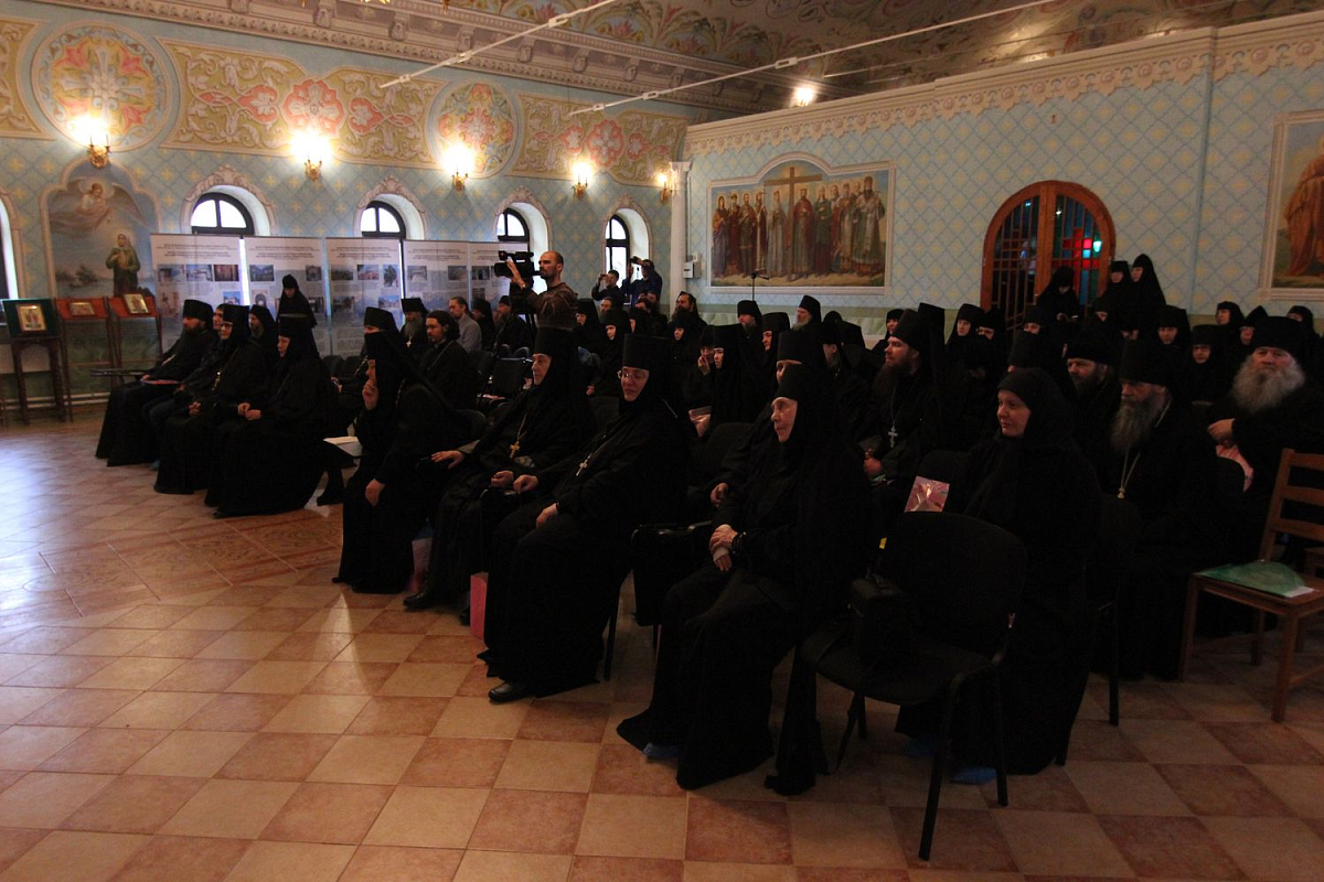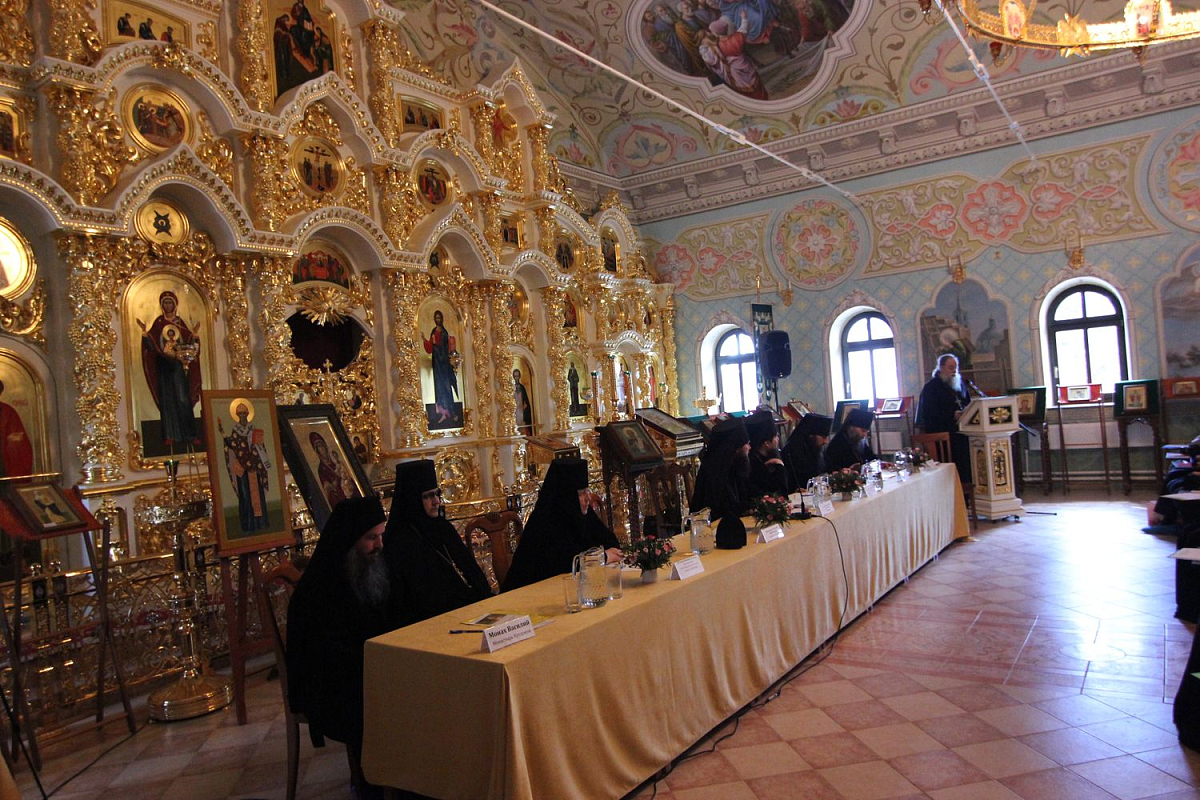 По окончании богослужения в монастырском храме Святой блаженной Ксении Петербургской конференция начала свою работу с приветственного слова епископа Переславского и Угличского Феодора, обращенного к собравшимся в зале архимандритам, игуменам и игумениям и всем монашествующим, а также благочестивым мирянам.