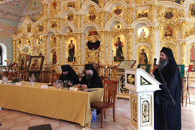 Затем наместник Воскресенского монастыря г. Углича игумен Димитрий (Горбатюк) рассказал о прошедшем накануне синодальном собрании, озвучил поднимавшиеся проблемы и вынесенные решения, зачитал документ о создании комиссий синодального отдела по епархиальным монастырям.