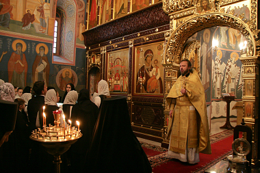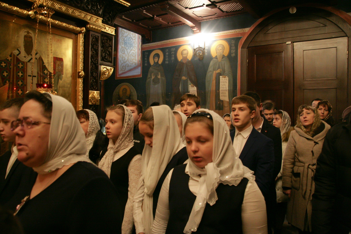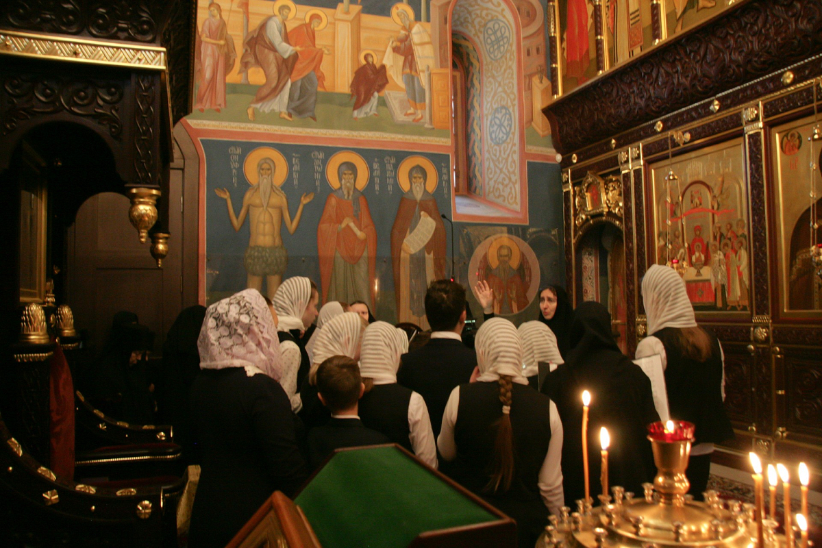 Форум начал свою работу с первой площадки – «Литургической» (руководители: заместитель директора по ВР С.Л. Суслова и учитель церковного пения О.Н. Дёмина), которая прошла во Введенском соборе Владычнего женского монастыря. Церковный хор гимназии под управлением монахини Ксении (Криницыной), состоящий из учащихся 5–8 классов, пел на клиросе совместно с сестрами обители, в алтаре послушание нес ученик 10 класса.