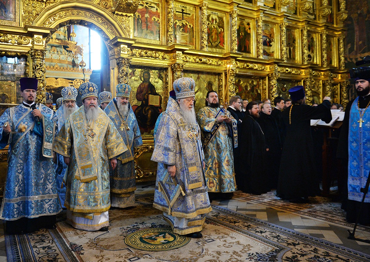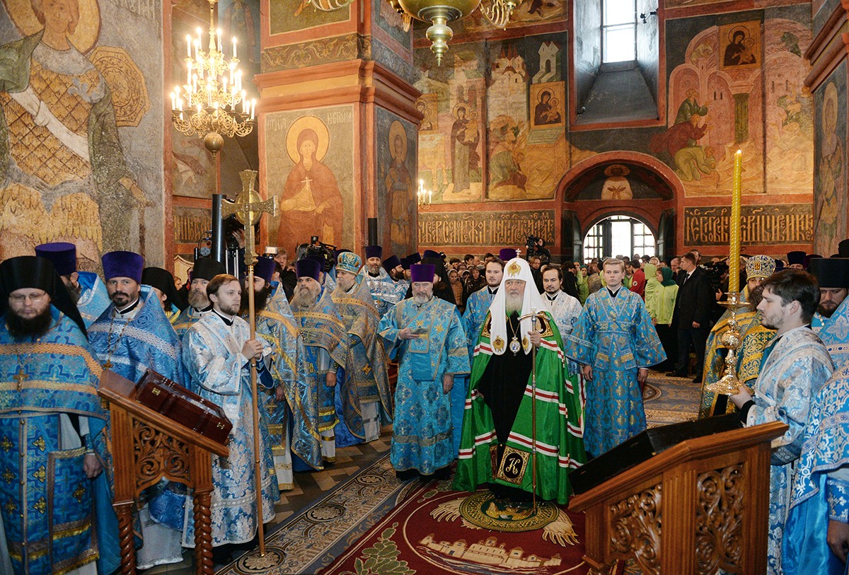 Его Святейшеству сослужили: митрополит Крутицкий и Коломенский Ювеналий; епископ Илиан (Востряков); епископ Видновский Тихон; епископ Серпуховской Роман; епископ Солнечногорский Сергий, руководитель Административного секретариата Московской Патриархии; епископ Воскресенский Савва, первый заместитель управляющего делами Московской Патриархии; епископ Балашихинский Николай; епископ Зарайский Константин; протоиерей Владимир Диваков, секретарь Патриарха Московского и всея Руси по г. Москве; архимандрит Иринарх (Денисов), настоятель единоверческого храма Архангела Михаила в Михайловской Слободе (Раменский район Московской области); духовенство Москвы и Московской области.