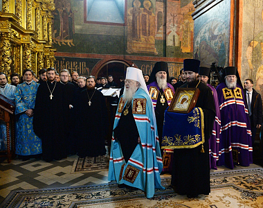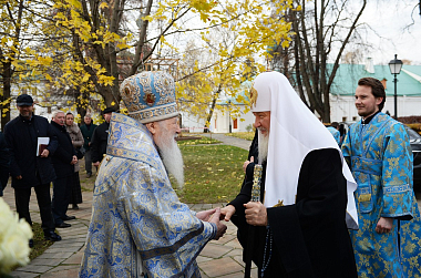 Затем Святейшего Патриарха приветствовал митрополит Ювеналий, вручивший Его Святейшеству Казанскую икону Божией Матери, написанную сестрами Новодевичьей обители.