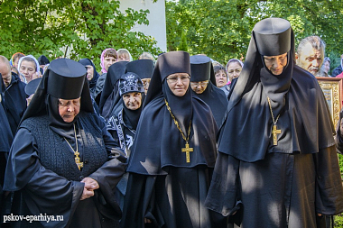 За богослужением молились настоятельница Рождества Богородицы Снетогорского монастыря игумения Татиана (Пашкова), настоятельница Спасо-Казанской обители г. Острова игумения Маркелла (Павлова), настоятельница Спасо-Елеазаровского монастыря игумения Евфросиния (Головнева), насельницы обителей, многочисленные прихожане и паломники.