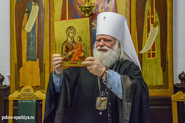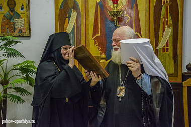 В завершение настоятельница обители игумения Татиана (Пашкова) поблагодарила Псковского архипастыря за совершенное богослужение в день престольного торжества и преподнесла Владыке образ Пресвятой Богородицы «Тихвинская», а сестринский хор монастыря исполнил духовные песнопения.