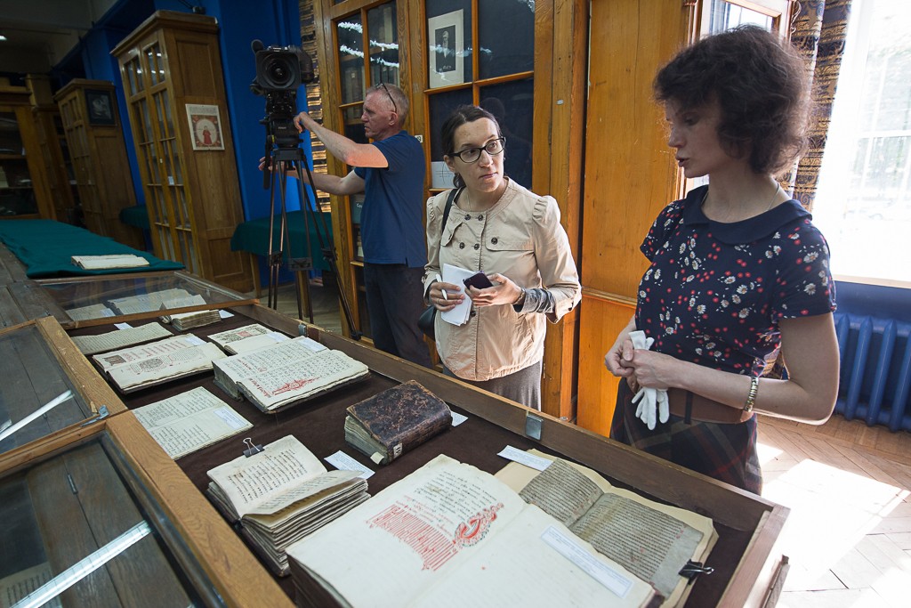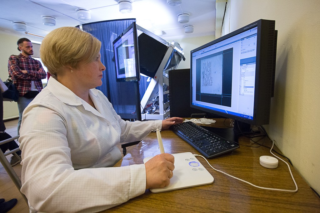 Журналистам показали процесс оцифровки рукописей, включающий несколько этапов: сканирование, контроль качества, постобработка в графическом редакторе, повторный контроль качества и внесение оцифрованного документа в фонд библиотеки.