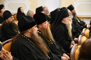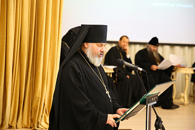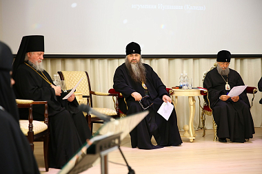 В конференц-зале Паломнического центра Дивеевского монастыря в президиуме также присутствовали митрополит Саранский и Мордовский Зиновий, епископ Краснослободский и Темниковский Климент, викарий Нижегородской епархии епископ Балахнинский Илия, епископ Ардатовский и Атяшевский Вениамин, епископ Выксунский и Павловский Варнава, епископ Лысковский и Лукояновский Силуан, а также представлявший Чувашскую митрополию наместник Свято-Троицкого монастыря г. Чебоксары архимандрит Василий (Паскье), настоятельница Зачатьевского ставропигиального монастыря Москвы, заместитель председателя Синодального отдела по монастырям и монашеству игумения Иулиания (Каледа) и настоятельница Дивеевского монастыря игумения Сергия (Конкова).
