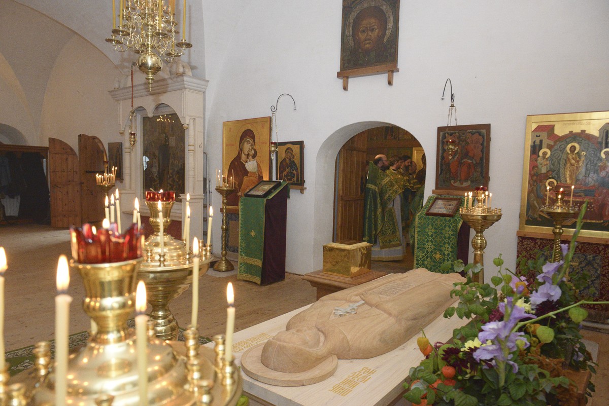 На острове ковчег с мощами был перенесен с катера на берег, и настоятель монастыря игумен Дионисий (Воздвиженский) вместе с иеромонахом Александром (Кораблевым) внесли ковчег с мощами в Успенский храм в восстановленной колокольне.