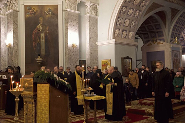 Накануне в Дмитровском соборе Спасо-Яковлевского Димитриева монастыря было отслужено праздничное всенощное бдение с акафистом у раки мощей святителя. Во время полиелея молящиеся имели возможность приложится к открытым мощам святого.