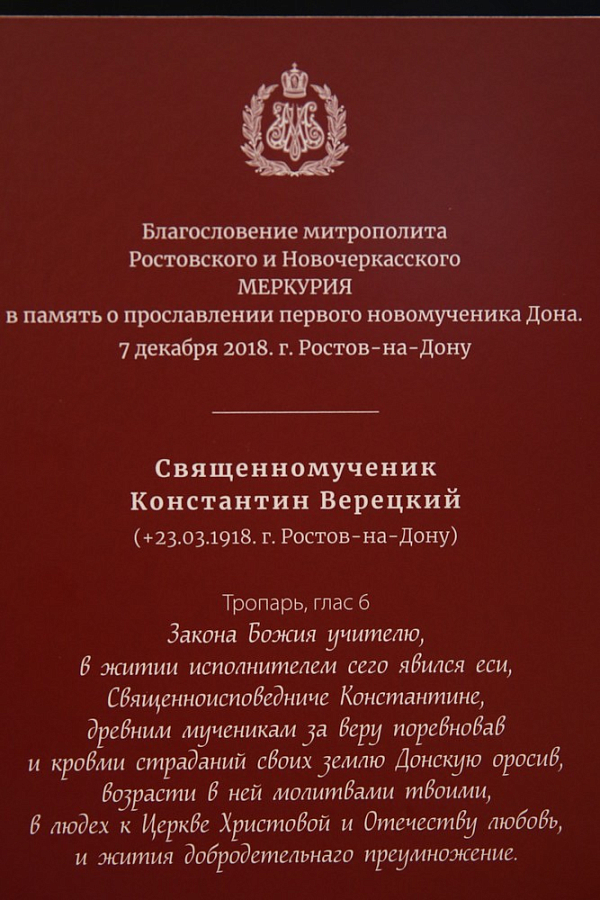 7 декабря 2018 года в Свято-Иверском женском монастыре г. Ростова-на-Дону состоялось прославление священномученика Константина Верецкого – первого ростовчанина, причисленного к лику святых Русской Православной Церкви для общецерковного почитания.