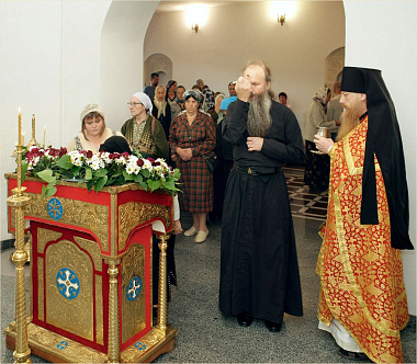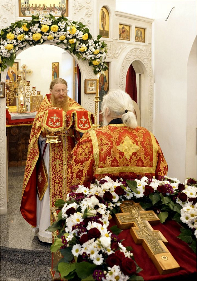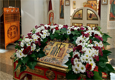Крест, украшенный цветами был изнесён на центральный аналой, где он будет пребывать для поклонения до отдания праздника.