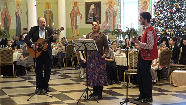 Гости монастыря Леонсия Эрденко и ее семья исполнили романсы, песни и колядки под аккомпанемент гитары и скрипки. Леонсия с первых дней возрождения монастыря стала другом обители.
