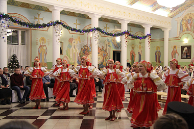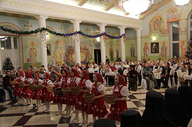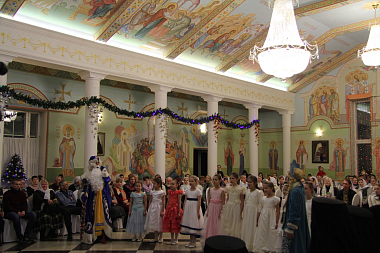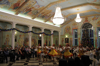 Юрий Николаевич остался в обители и посетил величественное ночное Рождественское богослужение в главном соборе монастыря. Праздник продолжился угощением всех молящихся в большом зале монастырской трапезной и Рождественским представлением девочек-сирот приюта «Отрада».